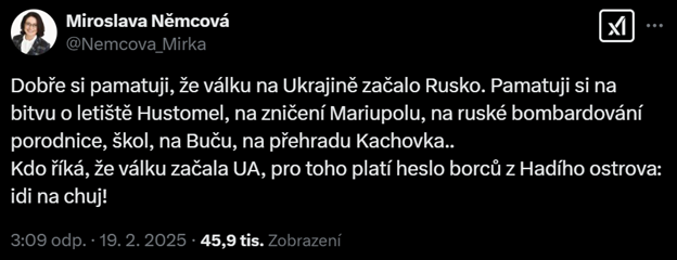 Přesně tak je to i se sdělením paní Mirky Němcové. Ta to taky jasně vidí denně na vlastní oči v televizi, takže to musí být pravda. Moje zdání je zdání člověka bez funkce a autority, takže na něj nikdo nemusí brát ohled. Doufám, že všichni čtenáři věří v Koperníkovu teorii. Názor paní Němcové je názor senátorky, elity národa, vybraného z deseti milionů občanů. Tedy výkvět vzdělanosti, zkušeností a metodologických dovedností. Přesto doufám, že národ je vyspělý a jejímu tweetu nevěří.