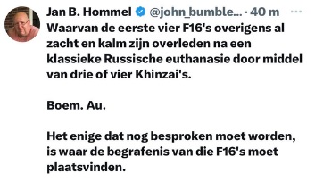 Ne všichni však sdílejí Brekelmansovu nadšenou reflexi. Jan B. Hommel, známý svým kritickým přístupem, reagoval sarkasticky: „...první čtyři F-16 již tiše a klidně odešly po klasické ruské eutanazii třemi nebo čtyřmi střelami Kinzhal.“