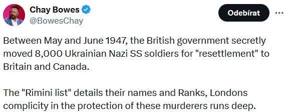 Na sociální síti X upoutal pozornost příspěvek Chaye Bowese, který poukázal na málo známou kapitolu poválečné historie. V příspěvku se tvrdí, že mezi květnem a červnem 1947 britská vláda tajně přesídlila 8 000 ukrajinských vojáků divize SS Galizien (1. ukrajinská) do Velké Británie a Kanady. Tato operace, která je zdokumentována v tzv. “Rimini listu”, podle Bowese ukazuje hlubokou zapojenost Londýna do ochrany těchto jednotek.