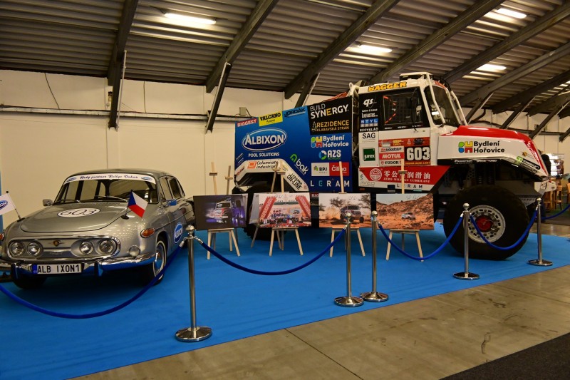 Automobil pro rally zaparkovaný v prostorné garáži kam se vejdou i kola byl nepřehlednutelný